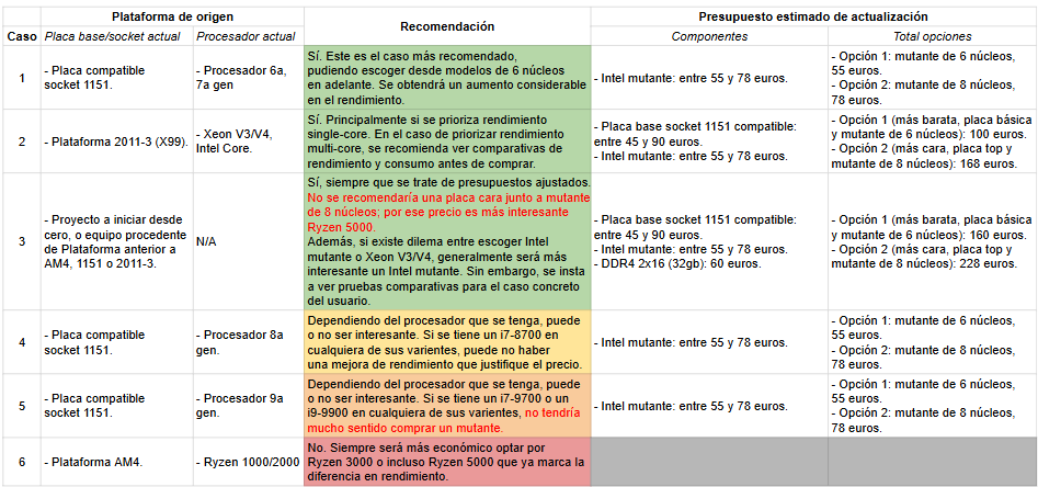 Finalmente, y con la intención de elaborar una conclusión lo más clara posible, voy a dejar a continuación una tabla con los diferentes casos en los que se estima que podría ser recomendable o no para el usuario optar por un Intel mutante de este tipo.